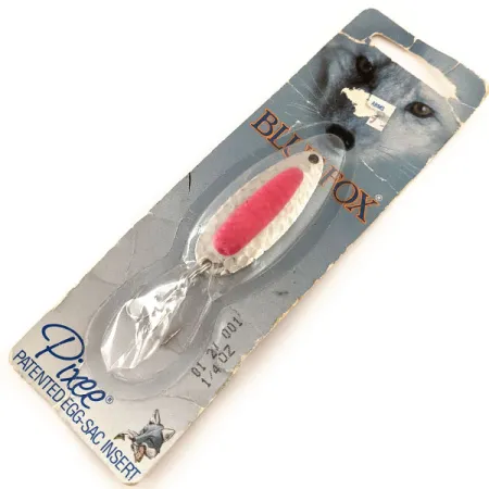 Un vibrante inserto a forma di sacca d'uova rosa fluorescente si trova al centro della lama in nichel martellato, fungendo da elemento visivo distintivo di questo esemplare. Catalogato con il codice prodotto 11858, l'artificiale misura 4,5 cm (1 3/4") e pesa 7 g (1/4 oz), fornendo la massa necessaria per lanci a lunga distanza anche con vento contrario costiero. La robusta costruzione in ottone è progettata per resistere agli ambienti corrosivi tipici dell'acqua salata e delle forti correnti fluviali. Questo Blue Fox Pixee è inutilizzato, conservando la sua confezione originale del 1984 dell'era di Cambridge, Minnesota. Le proprietà UV-reattive e la texture martellata sono studiate per un'alta visibilità e bagliori durante le sessioni di lancio e traina. I pescatori utilizzano tipicamente questo modello per specie come la trota steelhead, il salmone e il luccio, sfruttando la sua capacità di lavorare sia in profondità che in superficie. Sul retro della scheda, le istruzioni tecniche descrivono tecniche specializzate come il lake pumping e il river tumbling. L'esemplare ha una valutazione di condizione pari a 6, poiché le componenti metalliche sono fresche di fabbrica e non sono mai state in acqua.