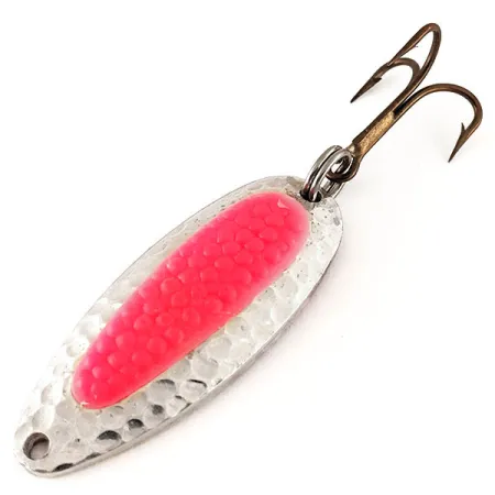 Con un peso di 1/2 oz (14 g), questo corpo in ottone ad alto spessore è costruito per tagliare i venti costieri e raggiungere facilmente le buche profonde dei fiumi. La lunghezza di 2 1/4" (5,5 cm) presenta una classica finitura in nichel martellato, progettata per disperdere la luce proprio come le scaglie riflettenti di un pesce esca. Una caratteristica distintiva del codice 12363 è l'unico inserto che simula un uovo di salmone; su questo specifico modello Blue Fox Pixee UV, l'inserto rosso fornisce un bersaglio ad alta visibilità che brilla intensamente in acque scure o in condizioni di scarsa illuminazione. Viene fornito con un amo triplo con finitura bronzo e un robusto anello spaccato, pronto per resistere alla pressione di salmoni, steelhead o lucci. Questo artificiale affonda le sue radici nei design originali National Expert Bait, perfezionati per un rollio naturale tra le correnti dei fiumi o una traiettoria costante durante la traina. L'esemplare è in ottima forma, mostra chiari segni di un'accurata conservazione e merita una valutazione delle condizioni di 5/5.