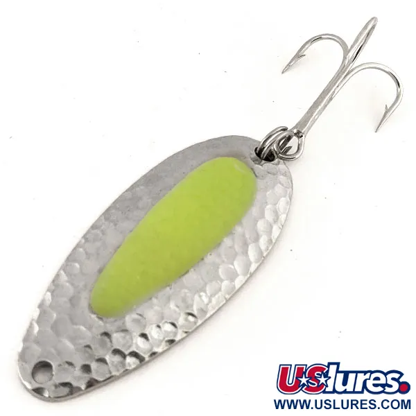 Lungo 6,5 cm (2 1/2 pollici), il corpo in ottone ad alto spessore di questo ondulante è costruito per fendere i venti costieri e raggiungere le buche profonde dove spesso stazionano salmoni e steelhead. La finitura in nichel martellato offre una superficie testurizzata che cattura e diffonde la luce, mentre l'inserto centrale giallo vivace, che simula un uovo di salmone, è progettato con fluorescenza UV per rimanere visibile in acque torbide o in condizioni di scarsa illuminazione. Identificato dal codice prodotto 12701, questo artificiale da 24 g (3/4 oz) non mostra segni di usura e ha una valutazione di condizione 5/5. Originariamente parte della linea National Expert Bait (NEBCO) prima che il marchio passasse a Blue Fox, questo modello specifico monta un'ancoretta di alta qualità collegata tramite un robusto anellino spaccato. È una scelta efficace sia per il lancio in forti correnti fluviali che per la traina in acque libere, dove la sua densità permette una presentazione profonda. L'estremità anteriore presenta un punto di attacco pulito, destinato all'uso con una girella a moschettone per favorire un naturale movimento di rotazione durante il recupero.