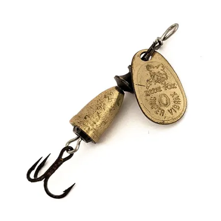 Il logo originale Blue Fox e il marchio "Super Vibrax" impressi direttamente sulla pala in ottone identificano questo classico cucchiaino rotante di misura 0. Con un peso di 3,4 g (1/8 oz), questo modello compatto misura esattamente 4,5 cm dall'occhiello superiore alla curva dell'ancoretta. La finitura in ottone invecchiato del corpo a goccia e della pala ovale riflette la sua natura vintage autentica, con un grado di conservazione di 4/5. Il retro della pala rivela la sua origine con l'incisione "MADE IN FINLAND" e il brevetto USA 4163338, a testimonianza del design specifico contro la torsione della lenza. Il corpo a campana è progettato per alloggiare un ingranaggio interno che crea suoni a bassa frequenza quando la campana esterna lo colpisce durante il recupero. Questo esemplare, identificato dal codice prodotto 13178, presenta l'iconica finitura in ottone, da sempre un punto di riferimento per la pesca a trote e persici in acque chiare. La componentistica rimane robusta, con l'ancoretta originale dal finale scuro saldamente fissata all'asse. Questi vecchi modelli finlandesi sono particolarmente ricercati dai collezionisti per la risonanza specifica della campana in ottone e la precisione dell'assemblaggio.