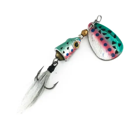 Motivi Rainbow Trout adornano la paletta a goccia e la testa fusa di questo rotante da 3/16oz (6g). Contrassegnato dal codice 7981, il Blue Fox Vibrax Shallow Foxtail misura 2 1/4" (5,5 cm) e monta una paletta argento misura 2. Il fronte della paletta presenta un vivace gradiente verde acqua e rosa, evidenziato da segni triangolari neri e punti blu per simulare i fianchi di una trota. Un corpo a campana zavorrato, sagomato come una testa di pesce con occhio trasparente, lavora insieme a una perlina spaziatrice color ottone per mantenere la stabilità. Il retro della paletta reca punzonati il nome del produttore e la taglia, confermando l'origine USA. Per un profilo naturale, l'ancoretta è vestita con un folto ciuffo di pelo bianco-grigiastro, creando il caratteristico aspetto foxtail. Questo esemplare è in eccellenti condizioni 5/5, con finiture originali e componenti puliti.