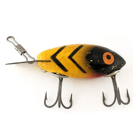 Una livrea gialla con caratteristici galloni neri riveste questo corpo in legno, a testimonianza di un'epoca classica della produzione di esche americane. Con una lunghezza di 6 cm e un peso di 7 g, questo modello Bomber riporta il codice prodotto 12475 e risale al periodo di produzione 1949-1970. La finitura presenta un fine e visibile craquelé sulle sezioni gialle e nere, che gli conferisce una valutazione di stato di 4/5 pur preservandone l'autentico aspetto vintage. Un vivace occhio arancione con pupilla nera è posizionato sulla sezione della testa dipinta di scuro, fornendo un punto focale ad alto contrasto per specie come luccio, persico reale e aspio. Questa esca galleggiante è progettata per raggiungere profondità di 2,0 m durante il recupero. L'armatura è composta da due ancorette montate in pancia e da un sistema di attacco della lenza in metallo fissato nella parte posteriore.