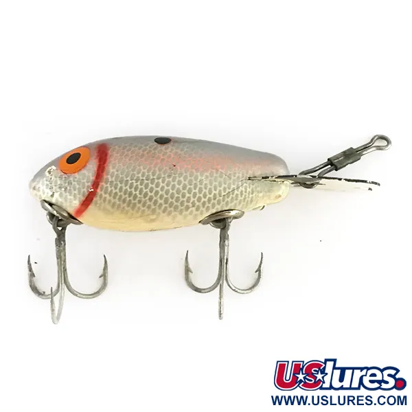 Toni argento e bianco ricoprono il corpo in legno di questa esca classica, che rappresenta l'era di produzione tra il 1949 e il 1970. Con un peso di 10 g (1/3 oz), la serie Bomber 200 series è stata progettata per una profondità di affondamento fino a 2 m (6,5 ft) per insidiare predatori attivi come luccio, aspio e persico. La finitura mostra un intricato motivo a squame a rete, accentuato da una distintiva striscia rossa sulle branchie, una singola macchia nera sulla spalla e grandi occhi arancioni con pupille nere. Una valutazione delle condizioni di 3/5 riflette la storia autentica del modello, con lievi segni d'uso e piccole perdite di vernice visibili principalmente intorno alle sezioni del muso e della coda. Due ancorette sono fissate alla parte inferiore di questo esemplare prodotto negli USA, identificato dal codice prodotto 8502. La paletta metallica montata posteriormente rimane saldamente fissata, servendo come tratto tecnico distintivo di questo modello galleggiante vintage.