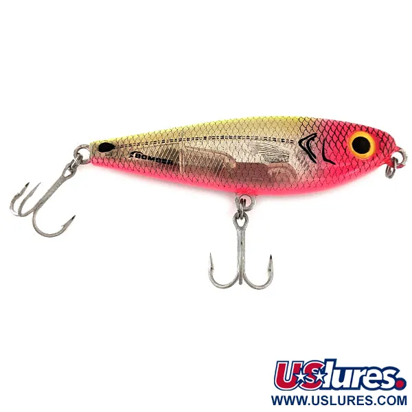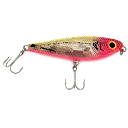 Con un profilo di 9 cm (3 1/2"), il Bomber Badonk-A-Donk Low Pitch rappresenta una scelta sostanziale per la pesca a galla, specificamente per la cattura di lucci e persici. Questo esemplare, identificato dal codice prodotto 11566, presenta un'estetica vivace con testa e pancia di un rosa intenso che sfumano in scaglie oro e argento lungo i fianchi. A differenza di molte esche topwater che si affidano a rattling acuti, questo modello utilizza una camera sonora interna a bassa frequenza per creare una firma acustica più profonda. Con un peso di 14g (1/2oz), garantisce una massa sufficiente per lanci controllati anche in presenza di brezza leggera. L'esca è armata con due ancorette argentate affilate e presenta vistosi occhi gialli con grandi pupille nere. I collezionisti apprezzeranno le condizioni 5/5 di questo pezzo, che appare pulito con una finitura ben conservata e scritte nitide. Il marchio Bomber è ben visibile sulla sezione argentata del corpo, identificando la sua origine USA.