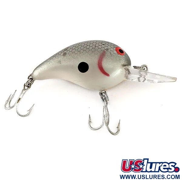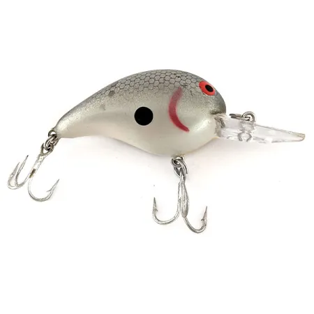 Una distinta trama a scaglie esagonali argentate copre il dorso superiore di questo crankbait da 1/3oz (10g), fornendo un aspetto strutturato rispetto ai fianchi lisci con sfumatura dal grigio al bianco. Questo Bomber Fat A B05F prodotto negli USA, identificato dal codice prodotto 12427, presenta un prominente punto laterale nero e un taglio branchiale rosso curvo dietro grandi occhi rossi con pupille nere. Con una lunghezza di 2" (5 cm), il corpo galleggiante è dotato di una paletta arrotondata trasparente ottimizzata per una profondità di esercizio di 1,8-2,4 m (6-8 ft). L'armatura è composta da due ancorette originali con finitura argentata, che lo rendono una scelta classica per lo spinning a persici o cavedani. In condizioni 5/5, l'esca non mostra segni di utilizzo, mantenendo la sua finitura lucida su tutto il profilo.