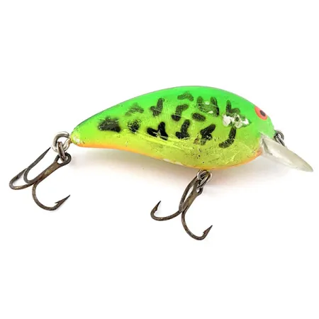 Pigmenti UV fire tiger vibranti ricoprono il corpo da 5,1 cm (2 pollici) di questo crankbait, una colorazione iconica progettata per un'alta visibilità in diverse condizioni d'acqua. Questo specifico esemplare, catalogato con il codice prodotto 18484, pesa 9,4 g (1/3 oz) e rappresenta una scelta versatile sia per lo spinning che per la traina. La livrea presenta un dorso verde brillante con macchie scure e naturali e un ventre arancione caldo, abbinato a caratteristici occhi rossi e neri. Essendo un modello floating, è progettato per scendere a una profondità compresa tra 0,9 e 1,8 m (3-6 piedi) durante il recupero. Per essere un pezzo vintage, si trova in uno stato di conservazione 4/5; le superfici sono pulite, con solo lievi segni di utilizzo precedente sulla paletta trasparente e sulle parti metalliche. Le ancorette originali sono intatte, pronte per insidiare specie come il luccio e il lucioperca.