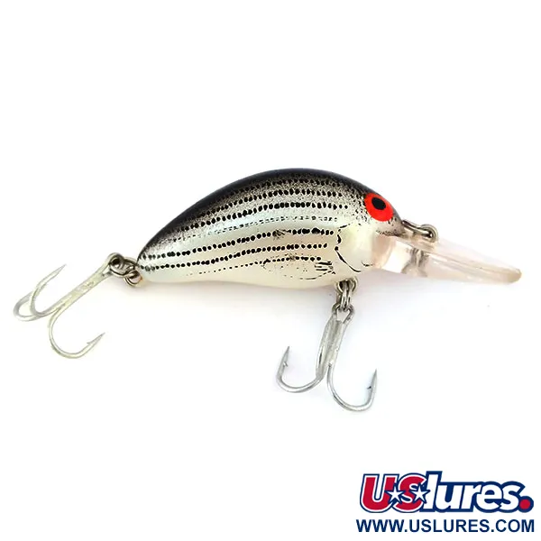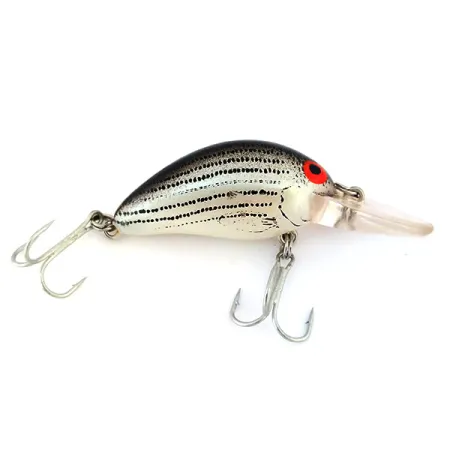 Sottili strisce nere orizzontali percorrono il corpo argentato di questo Bomber Model B 4A, creando un motivo ad alto contrasto completato da un dorso nero profondo. Identificato dal codice prodotto 10605, questo artificiale da 4,5 cm (1 3/4") è in condizioni 5/5, mantenendo il rosso vibrante dei suoi occhi sovradimensionati. Progettata per profondità comprese tra 0,9 m (3 ft) e 2,1 m (7 ft), la paletta trasparente è studiata per lo spinning o la traina a lucci e sandre. Con un peso di 7 g (1/4 oz), questo crankbait galleggiante prodotto negli USA è armato con le sue ancorette argentate originali e un anello spaccato in acciaio inossidabile.