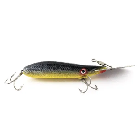 La scritta "BURKE BIG DIG" è chiaramente impressa sulla paletta affondante sovradimensionata in metallo, mettendo in risalto i metodi costruttivi unici della Burke Flexo-Products Company con sede nel Michigan. Identificata dal codice prodotto 23226, questa esca galleggiante da 1/2 oz (14 g) è realizzata nel caratteristico materiale in gomma morbida del brand, marchio di fabbrica della loro produzione dal 1950 fino ai primi anni '90. La livrea è caratterizzata da un dorso nero intenso che sfuma in una pancia giallo vibrante, con una trama a nido d'ape che simula le squame. Un tocco di rosso sulla gola e gli occhi bianchi e rossi creano punti di contrasto ideali per attirare lucci e grossi persici. La componentistica è in eccellenti condizioni, con due ancorette affilate e una girella già montata sulla paletta. Con una valutazione di 5/5, il corpo si mantiene elastico e la verniciatura è straordinariamente ben conservata. Questo plug in gomma di fabbricazione americana rappresenta un'epoca in cui Burke puntava a creare esche dal movimento più naturale e realistico rispetto alle classiche esche in plastica dura o legno.