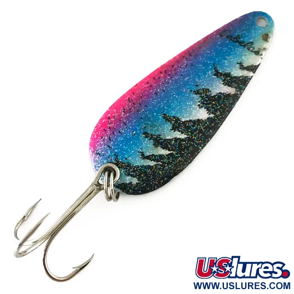 Un peso di 12 g conferisce a questo cucchiaino ondulante la densità necessaria per lunghi lanci in acque profonde o attraverso le correnti dei fiumi. La livrea Trota è visivamente accattivante, caratterizzata da una vivace sfumatura rosa neon e blu, fortemente accentuata da glitter multicolore. Lungo il bordo del corpo da 5,5 cm, sagome nere di alberi sempreverdi creano un dettaglio ad alto contrasto sullo sfondo scintillante. Sulla testa dell'esca, il nome del marchio Cabela's è stampato in un carattere nero pulito. Il retro dell'ondulante è rifinito in argento lucido brillante, progettato per creare un lampo luminoso che contrasta con il lato anteriore verniciato. Questo esemplare prodotto negli USA, catalogato con il codice prodotto 8517, è dotato di un robusto anellino spaccato e di un'ancoretta affilata. Con una valutazione di 5/5, l'esca è in ottime condizioni con una finitura che rimane lucida e intatta.