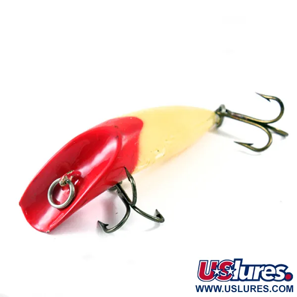 Con un peso di ben 28g (1oz), questo pezzo vintage mette in mostra l'iconica struttura a corpo cavo che definisce la tradizione del marchio. La testa rosso intenso sfuma in un corpo bianco crema, una livrea ad alta visibilità spesso scelta per insidiare i predatori in varie condizioni di trasparenza dell'acqua. Lungo esattamente 10cm (4"), l'esemplare identificato dal codice 1236 presenta la classica faccia incavata che funge da meccanismo di affondamento integrato. La dotazione comprende due ancorette montate in posizione ventrale e caudale e un robusto anello spaccato sul punto di attacco del filo. Le condizioni sono un rispettabile 4/5, mantenendo quella finitura liscia e lucida che i collezionisti ricercano. Realizzati in Canada, questi artificiali sono noti per il loro profilo unico e l'ottima castabilità.