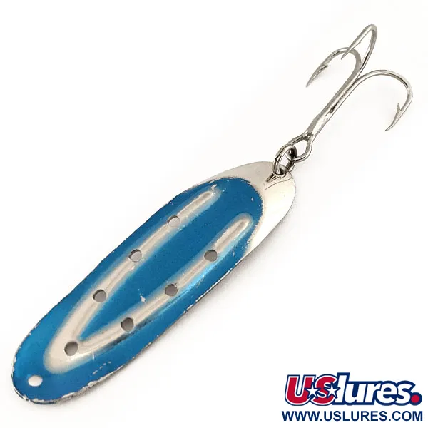 Lungo 6 cm (2 1/4"), questo Lake Products Charger è un classico esempio di esca da traina americana della metà del secolo scorso. La finitura Nickel / Blu è eccezionalmente conservata e presenta un caratteristico motivo a V creato dal contrasto tra la vernice blu vivace e la brillante nichelatura sottostante. Una serie di piccole perforazioni corre lungo il corpo, un elemento di design funzionale spesso utilizzato da Lake Products per influenzare il nuoto dell'esca nella colonna d'acqua. Con un peso di 6 g (3/16 oz), l'ondulante è dotato di un robusto amo triplo a curvatura larga fissato tramite un solido anello spaccato, pronto per l'uso o per l'esposizione. Questo specifico esemplare, catalogato con il codice 11292, mantiene una valutazione di 5/5, mostrando la lucentezza originale di fabbrica sulle superfici metalliche. Le origini del marchio si riflettono nella costruzione solida e nelle linee pulite tipiche dell'attrezzatura vintage prodotta negli USA.