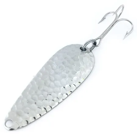 La nichelatura martellata crea una superficie altamente riflettente su questo cucchiaino Chippewa Steel Spoon da 10g (1/3 oz), una texture studiata appositamente per catturare la luce da più angolazioni. Lungo 5,5 cm (2 1/4"), questo artificiale Worth è un classico esempio della metallurgia americana di metà secolo che ha dominato le cassette da pesca per tutta la seconda metà del Novecento. La faccia anteriore è caratterizzata da una trama a fossette, mentre il retro rivela una finitura liscia stampata con il nome del marchio e l'origine USA. Questo esemplare, identificato dal codice prodotto 10965, mantiene un aspetto brillante e pulito coerente con la sua valutazione di condizione 5/5. Viene montato con un unico grande amo triplo collegato tramite un robusto anello spaccato sul retro. Questi cucchiaini venivano utilizzati per il lancio o la traina a lucci, black bass o trote di taglia in acque con diverse visibilità.