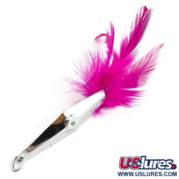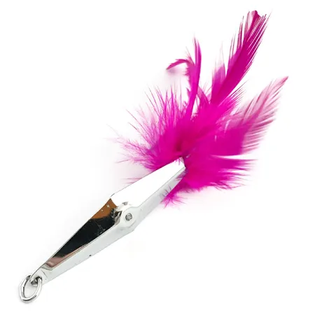 Con un peso di 5 g (3/16 oz), il corpo di questa creazione di James E. Clark è impreziosito da un vivace ciuffo di piume rosa acceso. Lungo 4,5 cm (1 3/4"), questo specifico Clark Spoon, identificato dal codice prodotto 5856, sfoggia una finitura cromata lucida tipica degli ondulanti di alta qualità prodotti negli Stati Uniti. La configurazione antialga si basa su un amo singolo nascosto tra le piume, ideale per pescare tra ostacoli e vegetazione senza incagliarsi. La superficie metallica riflettente e la minuteria sono ben conservate, con solo lievi segni di manipolazione coerenti con una valutazione di stato 4/5. Un anello spaccato è montato di fabbrica sull'occhiello anteriore per agevolare il collegamento diretto della lenza.