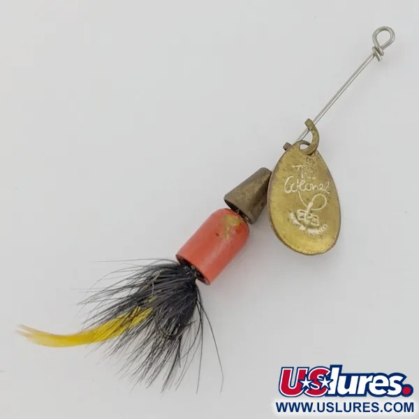 Componenti in ottone definiscono la struttura di questo cucchiaino rotante da 4 g (1/8 oz), caratterizzato da una paletta stampata con la scritta "THE Colonel". Un corpo cilindrico rosso brillante è posizionato dietro un peso conico in ottone, fornendo un profilo solido per il lancio. Il telaio da 5,5 cm (2 1/4") è rifinito con un'ancoretta piumata, dotata di un folto hackle nero e di una singola piuma gialla finale. Classificato con una condizione di 5/5, le superfici in ottone rimangono lucide e la vernice rossa sul corpo è ben conservata. Catalogato con il codice prodotto 24524, l'assemblaggio è fissato su un asse in metallo dritto che termina con un semplice occhiello.