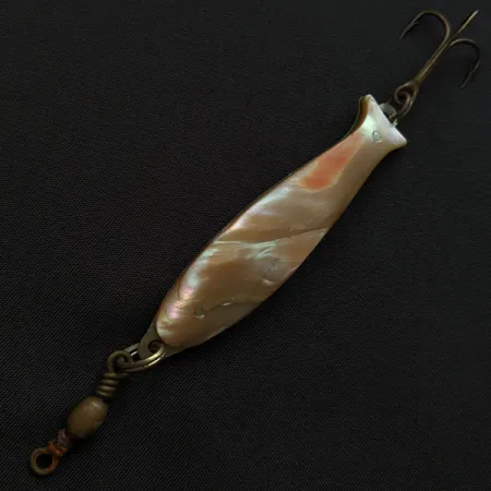 Con una lunghezza di 7 cm (2 3/4"), questo ondulante Compac mette in risalto l'artigianalità della produzione giapponese di attrezzatura della metà del secolo attraverso l'uso di un pezzo solido di madreperla iridescente. La conchiglia naturale è meticolosamente modellata per adattarsi al profilo dell'esca ed è ancorata alla base in metallo argentato da due rivetti a vista. Con un peso di 14 g (1/2 oz), il modello 19657 offre una massa significativa per il lancio o la traina profonda. Il lato posteriore metallico è lucido e liscio, in contrasto con la lucentezza organica dell'intarsio in abalone. Per la componentistica, l'esca è armata con una robusta girella a bariletto in testa e un'ancoretta bronzata in coda. Questo specifico esemplare è in condizioni eccellenti, meritando una valutazione di 5/5. L'origine giapponese riflette un periodo in cui Compac era nota per l'importazione di ondulanti decorati in modo distintivo che univano fascino estetico e durata funzionale.