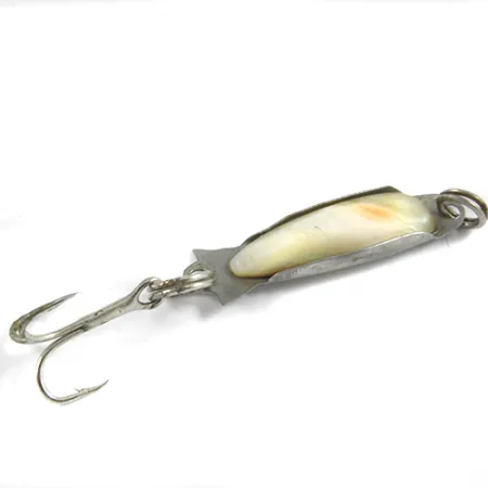 Madreperla naturale e nichel lucidato si uniscono in questo ondulante vintage Compac, che mette in mostra il classico stile di produzione giapponese. Con un peso delicato di 2,2 g (1/16 oz), l'esemplare misura 3 cm (1 1/4"). L'inserto in madreperla è saldamente fissato al corpo in metallo tramite alette ripiegate, offrendo un luccichio morbido e organico che completa il retro metallico riflettente. Con una valutazione delle condizioni di 4/5, l'esca rimane lucida e pulita, con il suo singolo amo triplo posteriore e l'anellino spaccato completamente intatti. Contraddistinto dal codice prodotto 3087, questo design è stato concepito per applicazioni finesse dove il lampo del nichel e la profonda lucentezza della conchiglia sono più efficaci.