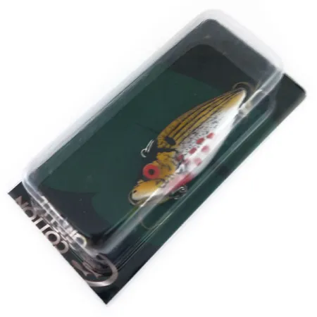 Ornato da un accattivante motivo a audaci strisce verticali su un dorso dorato, questo esemplare sfuma in una pancia bianca contrassegnata da distinti punti rossi. Identificato dal codice prodotto 9743, questo Super Spot da 1/4 oz (7 g) presenta un vivace occhio rosso che funge da punto focale sulla testa dai toni gialli. L'esca misura 2 1/4" (5,5 cm) di lunghezza e rimane nella sua confezione originale; con una condizione pari a 6, è completamente inutilizzata e conservata esattamente come uscita dalla fabbrica. Cotton Cordell ha progettato questo lipless crankbait affondante e rumoroso per una varietà di tecniche, tra cui il lancio e la traina a profondità variabile. Questa versatilità lo rende un elemento essenziale per insidiare specie che vanno dal pesce persico e il luccio fino alla trota e al salmone. La stirpe Super Spot è significativa nella storia del marchio, poiché Cotton Cordell ha contribuito a fare da pioniere nella categoria dei lipless crankbait con design come questo, radicati nelle origini di Hot Springs, Arkansas. La componentistica è custodita in sicurezza all'interno del blister, garantendo che la finitura e i componenti rimangano in condizioni impeccabili.