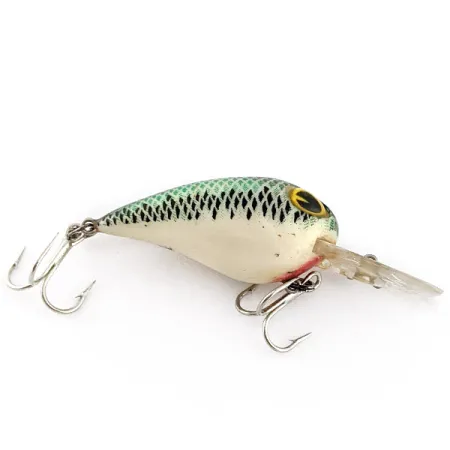 La livrea squamata sul dorso rivela una classica colorazione Bass verde e nera su questo esemplare da 5 cm. Cotton Cordell ha bilanciato questo Wiggle O con un peso di 7 g, uno standard per lanci di precisione in strutture intricate. La paletta trasparente riporta il nome "Wiggle O" inciso in rilievo, garantendone l'autenticità. Grandi occhi gialli con pupille nere profonde dominano il profilo frontale, situati appena sopra una gola sfumata di rosso che crea contrasto con il ventre color crema. Contraddistinto dal codice prodotto 23246, questo artificiale monta la componentistica originale, incluse due ancorette. Lo stato di conservazione è pari a 5/5, con una finitura ben preservata che mette in risalto il dettaglio minuzioso delle squame. Plastica stampata e schemi di verniciatura dettagliati definiscono quest'epoca di produzione dedicata agli appassionati di bass fishing.
