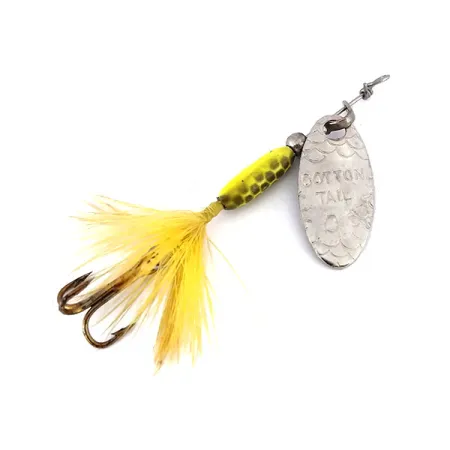 La paletta in nichel stampato presenta una leggera squamatura accanto al marchio inciso "COTTON TAIL". Questo cucchiaino rotante da 1,7 g (1/16 oz) è un pilastro della tradizione Cotton Cordell per pesci di piccola taglia e trote, prodotto negli USA. Il corpo in piombo giallo con macchie scure sfuma in un'ancoretta piumata di un giallo vivace per un profilo visivo naturale. Lungo 5,08 cm (2"), l'esemplare è in condizioni 5/5, con finiture e componenti originali. I collezionisti riconosceranno la variante Nickel/Giallo dal codice 10138. Il cavalletto distanzia la paletta dall'asse in acciaio, garantendo la rotazione durante il normale recupero.
