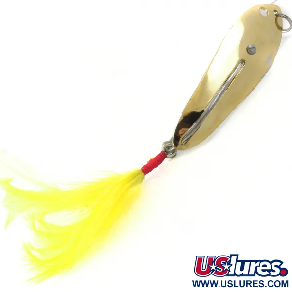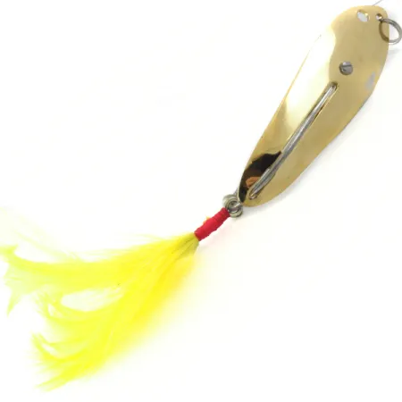 Una finitura dorata a specchio riveste il corpo stampato di questa esca Crippled Alewive, catalogata con il codice prodotto 4137. Con un peso di 35g (1 1/4 oz), l'ondulante adotta un particolare design antialga che include un ferretto protettivo per schermare la punta dell'amo principale dalla vegetazione fitta. Il corpo da 10cm (4") si distingue per la sua geometria asimmetrica e per un'insolita disposizione di un secondo amo nascosto sotto il dressing di piume gialle. Queste vivaci piume gialle sono fissate saldamente alla coda con un filo rosso acceso, creando un forte contrasto visivo con la superficie metallica dorata. La componentistica metallica, compresi l'attacco dell'amo fissato a vite e l'anellino spaccato superiore, appare lucida e ben conservata, senza segni di utilizzo. Questa costruzione specifica della Crippled Alewive Lure punta sulla robustezza per il lancio in zone con ostacoli sommersi.