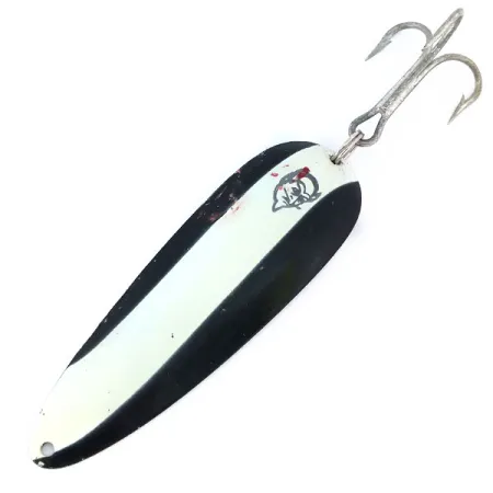 La nichelatura sul lato posteriore offre un contrasto ad alta visibilità rispetto alle strisce bianche e nere sul fronte di questo ondulante da 28 g (1 oz). I marchi Eppinger e Dardevle sono chiaramente stampati nel metallo sul retro, a testimonianza della lunga storia manifatturiera iniziata nell'officina di Lou Eppinger a Detroit nel 1906. Lungo 9 cm (3 1/2"), questo esemplare presenta il classico logo con la testa di diavolo e il distintivo dettaglio rosso sul lato concavo. Questo specifico artificiale, codice 11016, è in condizioni 4/5, con vernice ben conservata e componenti puliti. L'ancoretta heavy-duty è fissata da un robusto anello spaccato, progettato per resistere ai lanci a grandi predatori d'acqua dolce. Un singolo occhiello all'estremità affusolata garantisce il collegamento corretto per il casting tradizionale o la traina. Lo schema cromatico ad alto contrasto è una scelta versatile per diverse condizioni di trasparenza dell'acqua.
