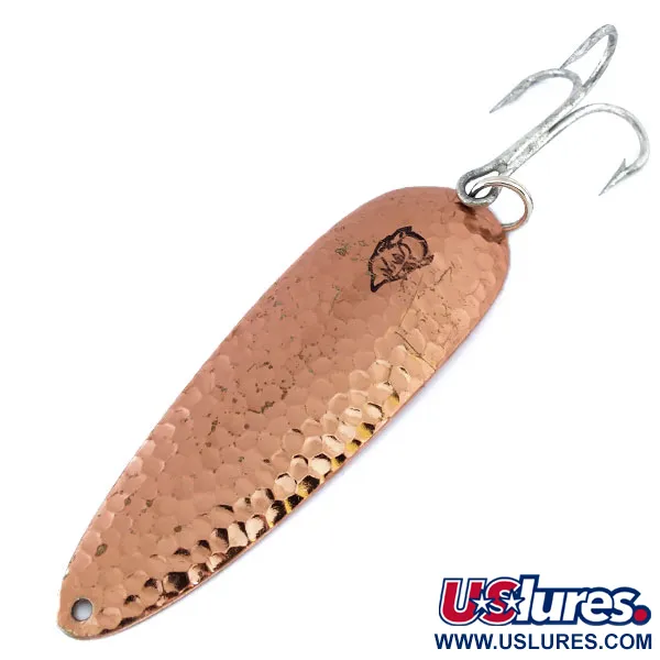 Le finiture in rame martellato come questa offrono una superficie testurizzata e riflettente che aiuta a frammentare la luce durante il movimento del metallo in acqua. Con un peso di 28 g (1 oz) e una lunghezza di 9 cm (3 1/2"), questo Eppinger Dardevle reca il codice prodotto 11055 e presenta l'iconico logo con la testa di diavolo stampato direttamente sulla faccia martellata. Il lato posteriore è lucido e riporta le incisioni autentiche 'DARDEVLE' e 'Eppinger Detroit', riflettendo le profonde radici del produttore nel Michigan fin dalla fondazione nel 1906 ad opera di Lou Eppinger. Questi ondulanti prodotti a Detroit erano un tempo considerati così affidabili che il governo li includeva nei kit di sopravvivenza dell'aviazione in tempo di guerra. Questo esemplare è in condizioni 5/5, con superfici pulite e marchi nitidi. È dotato di un'ancoretta di grandi dimensioni color argento fissata da un anello spaccato ad alta resistenza, destinata al lancio per grandi pesci predatori in varie condizioni di trasparenza dell'acqua. La forma specifica è appesantita per facilitare un recupero lento mantenendo l'assetto nella colonna d'acqua.