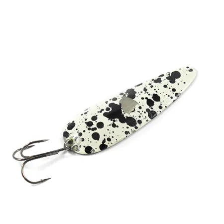 Caratterizzato da una finitura 'Dalmatian' ad alto contrasto, questo ondulante da 1oz (28g) rappresenta una scelta estetica unica nella leggendaria gamma Eppinger. Con una lunghezza di 9 cm (3 1/2"), l'esca presenta il tipico profilo concavo che garantisce il celebre movimento oscillante (wobbling) durante un recupero costante. Sul retro, la superficie nichelata è punzonata con le scritte 'DARDEVLET' e 'DETROIT U.S.A.', a testimonianza della tradizione produttiva iniziata da Lou Eppinger nel 1906. Questo specifico esemplare, identificato dal codice prodotto 2370, mantiene una valutazione dello stato di conservazione di 4/5, mostrando una verniciatura ben preservata sul lato convesso e una brillante lucentezza metallica sul retro. Il metallo di grosso spessore e l'ancoretta affilata riflettono la robustezza che un tempo rendeva queste esche dotazione standard nei kit di sopravvivenza dell'aviazione militare. L'impiego di un ondulante con retro in nichel come questo è una tattica collaudata per condizioni di acqua limpida, dove è necessario il massimo riverbero per attirare l'attenzione. Lo split ring rimane saldo, assicurando l'ancoretta per applicazioni gravose a casting o a traina.