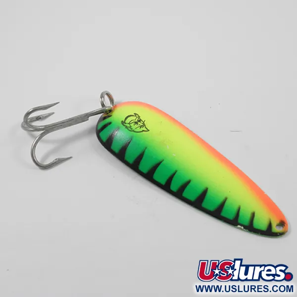 Con un peso di 1 oz (28 g), questo classico ondulante da lancio Eppinger presenta l'iconica livrea Fire Tiger sul suo corpo da 3 1/2" (9 cm). La finitura è un vivace gradiente di giallo neon e verde, bordato da una marcata linea arancione e impreziosito da strisce verticali nere lungo un lato. Sul retro in ottone, sono chiaramente visibili i timbri autentici "DARDEVLE" e "EPPINGER DETROIT" insieme all'indicazione del peso. Questo specifico esemplare reca il codice prodotto 2697 e mostra il classico logo con la testa di diavolo sul lato verniciato. La componentistica consiste in un robusto amo triplo argentato collegato tramite un affidabile anellino spaccato. Questa esca è in condizioni 5/5, riflettendo la cura meticolosa che ci si aspetta da un pezzo da collezione ben conservato. La struttura in ottone garantisce un riflesso naturale che completa i colori vivaci del lato superiore durante la pesca in diverse condizioni di luce.