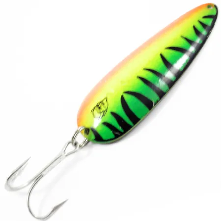 La brillante colorazione FireTiger crea un profilo ad alta visibilità su questo ondulante da 28g (1oz). La faccia anteriore sfuma tra vivaci tonalità di arancio, giallo e verde, punteggiate da nitide striature verticali nere e dall'iconico marchio del logo. Ruotando l'esca si scopre una finitura in ottone lucidato, dove il peso è chiaramente stampato nel metallo — un segno distintivo degli stampi proprietari che Eppinger utilizza da quando le operazioni si sono trasferite a Dearborn, Michigan, nel 1959. Con una lunghezza di 9cm (3 1/2"), la forma concava distinta dell'ondulante è progettata per un recupero costante a casting o a traina. L'attrezzatura consiste in un robusto amo triplo argentato fissato da un anellino spaccato. Questo esemplare, identificato dal codice prodotto 3776, mantiene una finitura eccezionalmente pulita, meritando una valutazione di 5/5.