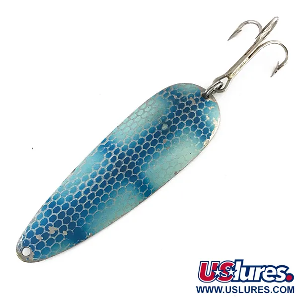 Chiaramente stampigliato sul lato concavo lucido, il marchio "Dardevle" Detroit U.S.A. ancora l'identità di questo classico di Eppinger. Questo ondulante da 9 cm (3 1/2") presenta una base celeste ricoperta da una scagliatura a nido d'ape blu più scuro. Il lato inferiore ha una finitura in nickel pulito, che fornisce un lampo ad alto contrasto durante un recupero costante o a traina. Contrassegnato con il codice 8410, questo esemplare da 28 g (1 oz) è costruito con il metallo pesante che ha reso i design di Lou Eppinger un elemento essenziale nelle cassette da pesca del Michigan dal 1906. Osservando la componentistica, l'ancoretta originale è fissata tramite un robusto anellino brisé, pronto per lanci impegnativi. In termini di condizioni, l'esca merita un punteggio di 4/5; nonostante una leggera perdita di vernice lungo i bordi esterni e un lieve assottigliamento delle scaglie, il metallo rimane lucido e la stampigliatura è nitida. È una testimonianza degli stampi di produzione utilizzati da Eppinger prima e dopo il trasferimento a Dearborn nel 1959. Durante l'azione di pesca, il peso di 28 g (1 oz) consente di raggiungere efficacemente gli strati d'acqua più profondi senza la necessità di zavorre aggiuntive.