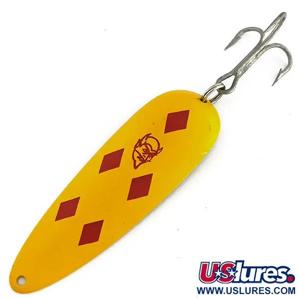 Cinque audaci rombi rossi risaltano sulla classica finitura gialla di questo ondulante vintage, identificandolo immediatamente come l'iconico pattern "Five of Diamonds". Con un peso di 28 g (1 oz) e una lunghezza di 9 cm (3 1/2"), questo esemplare reca la distintiva grafica della testa di diavolo stampata direttamente sulla superficie verniciata. Eppinger produce questi artificiali nel Michigan fin dai primi giorni di Lou Eppinger a Detroit, e questo modello specifico, catalogato con il codice prodotto 9103, mantiene la costruzione di alta qualità che ha reso il marchio un punto fermo nelle cassette da pesca nordamericane. Il lato posteriore presenta le autentiche stampigliature "Dardevle" e il relativo peso incisi nel metallo, che mostra una superficie eccezionalmente pulita. Dotato di un robusto amo triplo e di un solido anellino spaccato, è pronto per il casting o la traina a grandi predatori come il luccio o il muskellunge. Le condizioni di questo esemplare sono eccellenti, con una valutazione di 5/5. La forma oblunga e il profilo concavo sono i tratti distintivi degli stampi proprietari che Eppinger utilizza per garantire che ogni pezzo soddisfi i propri standard storici per l'attrezzatura prodotta in America.