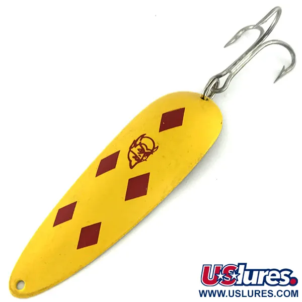 Il peso di 1oz (28g) è chiaramente stampato sul retro in ottone, stabilizzando questo classico cucchiaino ondulante. Questo esemplare Eppinger, catalogato con il codice 9501, presenta l'iconica livrea Five of Diamonds: una finitura in smalto giallo vibrante decorata con cinque diamanti rosso intenso e l'inconfondibile logo della testa di diavolo al centro. Con una lunghezza di 9 cm (3 1/2"), la superficie dell'ondulante è eccezionalmente pulita, meritando una valutazione 5/5 per la finitura ben conservata e le stampigliature nitide. Il retro reca le profonde incisioni 'DARDEVLE' ed 'EPPINGER', che mostrano la precisione degli stampi proprietari utilizzati nello stabilimento di Dearborn, Michigan. La componentistica è altrettanto formidabile, con un robusto amo triplo rifinito in argento che rimane affilato e privo di ossidazione. Sia nel lancio che nella traina, la forma concava è progettata per un recupero lento che produce un pesante movimento oscillante in acqua. Questa specifica combinazione di colori è da tempo la scelta dei pescatori per acque limpide, dove il giallo brillante e il retro color nichel garantiscono un'alta visibilità.