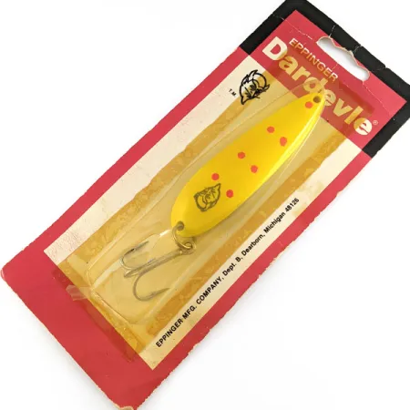 Cinque distinti punti rossi sono posizionati con precisione sulla faccia giallo brillante di questo ondulante da 1 oz (28 g). Con una lunghezza di 3 1/4" (8,5 cm), il Dardevle Cop-E-Cat di Eppinger, codice prodotto 21647, rimane un'opzione robusta per insidiare i grandi predatori d'acqua dolce. Sulla faccia del cucchiaino è impresso il riconoscibile logo con la testa di diavolo, marchio di fabbrica della Eppinger Mfg. Company di Dearborn, Michigan. Mentre il retro della confezione originale in cartone identifica il modello come 752e Nickel, questo specifico esemplare presenta una finitura gialla ad alta visibilità sul lato convesso. Questa esca non è mai stata utilizzata e rimane sigillata nel suo blister vintage originale. La componentistica prodotta negli USA è dotata di una robusta ancoretta progettata per lo spinning o la traina. Il cartoncino di supporto riporta ancora l'indirizzo originale del Department B e la menzione di un'offerta per il catalogo a un dollaro.
