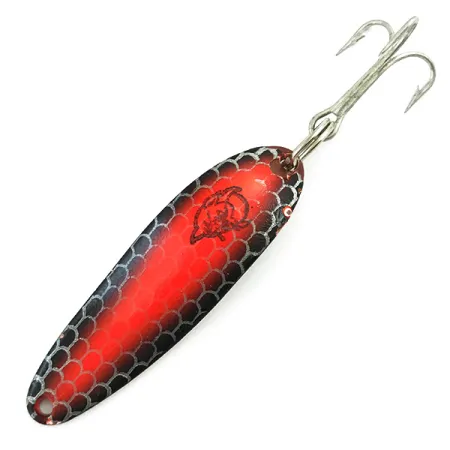 Sulla parte posteriore con finitura in nichel di questo ondulante da 1/3oz (10g) è impresso chiaramente il marchio "COR-E-CAT 7300 DETROIT USA", un autentico frammento di storia della pesca del Michigan. Il lato anteriore presenta un vivido motivo a scaglie rosse e nere, punteggiato dall'iconico logo con la testa di diavolo Dardevle posizionato vicino alla parte superiore. Con una lunghezza di 5,5 cm (2 1/4"), l'ondulante mantiene la sua caratteristica forma oblunga, realizzata con le matrici proprietarie che Eppinger utilizza sin dagli inizi dell'azienda nel 1906. Questo esemplare, contrassegnato dal codice prodotto 5498, è in ottime condizioni con una valutazione di 4/5, mostrando una finitura ben conservata e un retro metallico lucido. La minuteria è composta da un classico amo triplo color argento fissato tramite un anello spaccato, adatto a varie tecniche di lancio o traina. La combinazione del motivo a scaglie scure sul davanti e del retro in nichel riflettente segue la scuola di pensiero tradizionale per mantenere la visibilità in diverse condizioni di trasparenza dell'acqua.