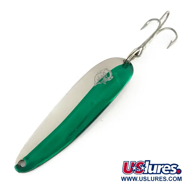 Una netta divisione diagonale tra nichel lucidato e verde traslucido definisce il fascino visivo di questo modello. Con un peso di 14 g (1/2 oz), questo Eppinger Dardevle Cop-E-Cat 7400 è un classico rappresentante della tradizione alieutica di Detroit. Il retro dell'ondulante riporta chiaramente i marchi stampati "COP-E-CAT 7400" e "DETROIT U.S.A.", legando la sua storia alle radici originali del marchio nel Michigan. Lungo 6,5 cm (2 1/2"), l'esca presenta l'iconico logo con la testa di diavolo inciso sul lato metallico colorato di verde. L'ancoretta a filo grosso è fissata saldamente tramite un anello spaccato nella parte posteriore, rendendola adatta sia allo spinning che alla traina. Questo pezzo specifico, identificato dal codice prodotto 8392, mantiene una valutazione di 5/5, mostrando i riflessi brillanti e le superfici pulite che ci si aspetta da un oggetto da collezione ben conservato. La forma concava del corpo è un segno distintivo della filosofia progettuale di Eppinger, nata nel seminterrato di Lou Eppinger nel 1906.
