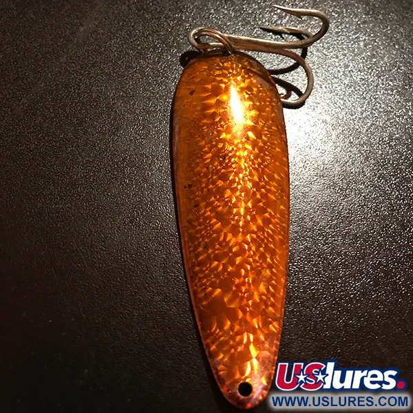 Con un peso di 28g (1oz) e una lunghezza di 9cm (3 1/2"), questo ondulante presenta l'inconfondibile finitura 'Crystal' che riflette la luce attraverso una superficie martellata dai toni aranciati. Questo esemplare specifico, catalogato con il codice prodotto 10963, è valutato 4/5, mostrando una leggera usura superficiale che riflette la sua autentica età pur mantenendo una brillante lucentezza. Stampate chiaramente sul retro in rame martellato ci sono le parole 'DARDEVLE DETROIT, USA', un marchio della storia manifatturiera dell'azienda prima del suo trasferimento a Dearborn nel 1959. Il retro color rame è una scelta funzionale per questo artificiale, poiché i pescatori utilizzano tradizionalmente questo tono metallico per mantenere la visibilità in acque torbide o velate. Il suo profilo concavo è progettato per produrre un movimento oscillante unico durante il recupero costante. La componentistica include un robusto anellino spaccato argentato e un'ancoretta affilata, montati per gestire grossi predatori. Questo classico di Eppinger rimane una testimonianza della visione originale del 1906 di Lou Eppinger per un cucchiaio da lancio affidabile.