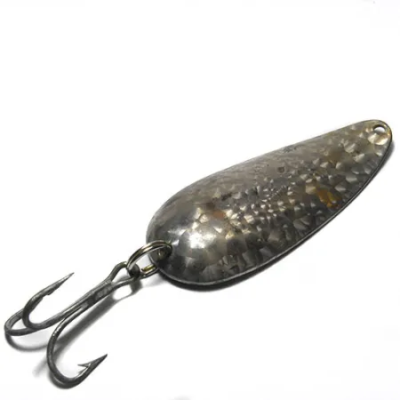Una finitura argentata martellata con motivo a squame cattura la luce su questo ondulante Eppinger da 3" (7,5 cm), un design prodotto con stampi proprietari fin dai primi giorni dell'azienda nel Michigan. Questo esemplare, con codice prodotto 0305, è rifinito nella colorazione Crystal (Scale Silver), che garantisce un riflesso sfaccettato in acqua rispetto ai comuni cucchiaini lisci. Il nome classico Dardevlet è chiaramente stampato nella parte concava dell'esca, a testimonianza della sua autenticità e della sua tradizione americana. In condizioni 4/5, le superfici metalliche rimangono brillanti e l'ancoretta originale è fissata saldamente tramite un robusto anellino spaccato. La geometria oblunga e la forma a cucchiaio profondo sono progettate da Eppinger per creare un movimento oscillante marcato durante il recupero costante. Per acque limpide, il retro nichelato e il fronte a squame offrono una presentazione naturale per i pesci predatori. L'occhiello di fissaggio all'estremità affusolata mostra un'usura minima, segno che questa esca è stata ben conservata nella scatola di un collezionista.