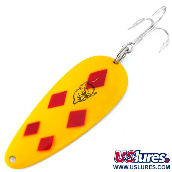 Cinque rombi rossi disposti su un vivace sfondo giallo definiscono l'iconico pattern di questo particolare esemplare. Misura 7 cm (2 3/4") e pesa 21 g (3/4 oz), rappresentando una scelta sostanziale per lo spinning o la traina. Girando l'esca, troverete il classico marchio "DARDEVLET" DETROIT U.S.A. stampato nel metallo con finitura dorata. L'ancoretta originale color argento è fissata saldamente tramite un robusto anello spaccato. Il logo nero con la testa di diavolo è centrato tra i rombi, segno distintivo dell'artigianato Eppinger da quando Lou Eppinger iniziò a produrli a mano nel suo seminterrato di Detroit oltre un secolo fa. Classificato con condizione 6, questo specifico articolo è inutilizzato e conservato con finitura e minuteria completamente intatte. È catalogato con il codice prodotto 10816. La forma concava dell'ondulante conferisce il caratteristico movimento oscillante durante il recupero, un design così efficace da essere stato incluso in passato persino nei kit di sopravvivenza dell'aviazione militare.