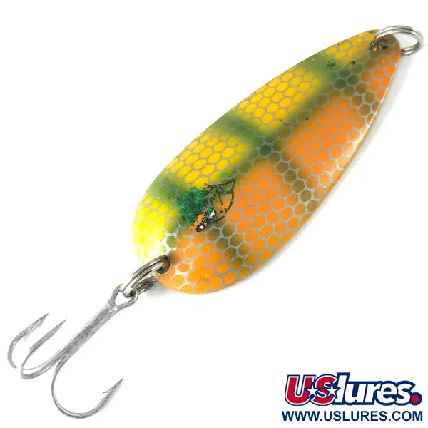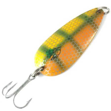 Vibranti barre verticali verdi su uno sfondo a nido d'ape giallo e arancione definiscono l'estetica di questo Eppinger Dardevlet vintage. Punzonato sul retro con 'DARDEVLET DETROIT USA', questo esemplare da 7 cm (2 3/4") precede il trasferimento del marchio a Dearborn nel 1959 e pesa solidi 21 g (3/4 oz). Il codice prodotto 3695 identifica un ondulante in condizioni 5/5, con una pulita finitura al nichel sulla superficie interna concava. La sua forma oblunga e la particolare tecnica di stampaggio sono progettate per creare un movimento oscillante durante il recupero lento. Questo cucchiaino prodotto negli USA è equipaggiato con l'ancoretta e gli anellini spaccati originali, a testimonianza della qualità che ha portato i dardi Dardevle a essere inclusi nei kit di sopravvivenza dell'aviazione militare. I collezionisti noteranno la nitidezza del marchio Detroit, che ne evidenzia la storia produttiva iniziale. Piccoli movimenti della punta della canna durante il recupero possono indurre uno sfarfallio che spesso scatena la risposta di pesci predatori incuriositi.