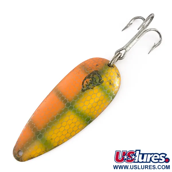 La nichelatura lucida cattura la luce sul retro di questo cucchiaino ondulante da 21g (3/4oz), caratterizzato dalle distintive punzonature "DARDEVLET" e "DEARBORN MI" ricercate dai collezionisti. Con una lunghezza di 7 cm (2 3/4"), la parte frontale di questa esca presenta una combinazione sorprendente di tonalità arancio e verdi disposte in un motivo a croce. Un fine rivestimento a nido d'abeille aggiunge una trama scintillante alla superficie verniciata, dove il famoso logo con la testa di diavolo nero rimane nitido. Identificato dal codice prodotto 8412, il profilo dell'ondulante si affida agli stampi esclusivi di Eppinger, garantendo la specifica profondità concava necessaria per il suo movimento oscillante tipico. La componentistica è in ottime condizioni, con un anello spaccato sicuro e un'ancoretta lucida. Proveniente dalla fabbrica di Dearborn, diventata sede del marchio nel 1959, questo pezzo è un eccellente esempio della storia dell'attrezzatura americana. Le condizioni sono valutate 5/5, mettendo in mostra la classica qualità di produzione del Michigan.