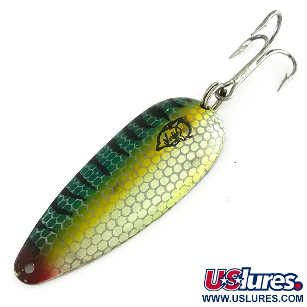 Chiaramente impresso sul retro color ottone si trova il nome "DARDEVLET" insieme alla sua origine "DEARBORN MI" e all'indicazione del peso "3/4 OZ.". Questo ondulante da 21 g (3/4 oz) presenta il distintivo pattern Perch, eseguito con una trama a nido d'ape simile a scaglie su una vivace sfumatura gialla e verde. Barre verticali scure offrono un contrasto realistico, rifinito con un sottile accento rosso sulla punta vicino all'occhiello. La faccia anteriore mostra in primo piano l'iconico logo con la testa di diavolo nera, firma del marchio Eppinger sin dalla sua fondazione nel 1906. Con una lunghezza di 7 cm (2 3/4"), l'hardware dell'esca consiste in una robusta ancoretta fissata tramite un anello spaccato nella parte posteriore. Questo esemplare, identificato dal codice prodotto 8442, rimane in condizioni eccezionali, meritando un punteggio di 5/5 per le sue superfici pulite e le incisioni nitide. Da quando Eppinger ha trasferito la produzione a Dearborn nel 1959, questa esca rappresenta un pezzo fondamentale della storia dell'attrezzatura del Michigan. Realizzata in ottone massiccio con un profilo appesantito, è progettata per il lancio e la traina in varie condizioni d'acqua.