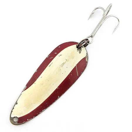 Una vivace finitura Red Devle caratterizza questo ondulante vintage, con l'iconica striscia centrale bianca tra due sezioni cremisi. Questo esemplare da 21g (3/4oz) mostra i segni autentici del tempo passato in acqua, con evidenti perdite di vernice e sbucciature lungo i bordi, che riflettono la sua storia di veterano della scatola da pesca con uno stato di conservazione pari a 3/5. Lungo 7cm (2 3/4"), il corpo in metallo spesso è stampigliato sul retro con la classica dicitura '“DARDEVLET” DETROIT U.S.A.', segno distintivo della produzione Eppinger del periodo 1920-40. Catalogata con il codice prodotto 22794, l'esca è dotata di un robusto split ring e di una singola ancoretta di grandi dimensioni in coda. Il retro metallico rimane riflettente, in contrasto con lo smalto usurato della parte anteriore. Questa esca di produzione americana è stata progettata per il lancio in acque profonde, dove il suo peso specifico permetteva di raggiungere profondità inaccessibili agli ondulanti più piccoli.