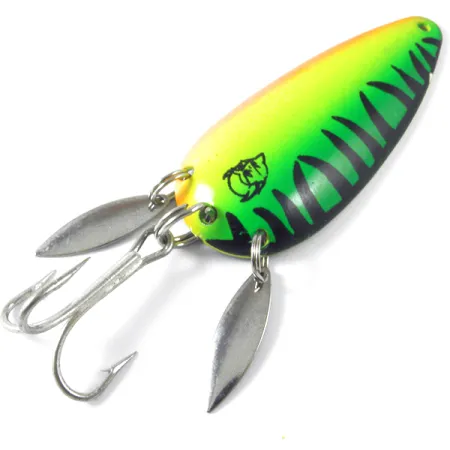 Il peso di 3/4oz (21g) è profondamente punzonato nel lato inferiore con finitura dorata, identificando questo ondulante come la dimensione sostanziale Dardevlet. Questo Eppinger Dardevle Dardevlet Klicker, contrassegnato dal codice prodotto 3755, sfoggia una vivace livrea Fire Tiger composta da tonalità giallo neon e verde con netti accenti verticali neri. Lungo 7 cm (2 3/4"), l'ondulante è dotato di due piccole lamelle sonore argentate fissate all'anello brisè posteriore, che forniscono flash e vibrazioni sonore durante il recupero. Il retro presenta il marchio del produttore Dearborn MI, segno distintivo della storia produttiva dell'azienda dal suo trasferimento nel 1959. Le condizioni di questo esemplare sono valutate 5/5, con minuteria e vernice che appaiono eccezionalmente pulite. Un classico amo triplo è montato in coda, pronto per un uso gravoso in ambienti d'acqua dolce.