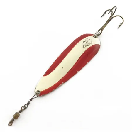 Un peso di 28 g (1 oz) garantisce la massa necessaria per lanci a lunga distanza anche in presenza di vento forte. La classica livrea Red Devle mostra lievi segni del tempo, con alcune mancanze di finitura lungo i bordi coerenti con un pezzo raro prodotto a Detroit negli anni '50. Lungo 9 cm (3 1/2"), l'ondulante esibisce chiaramente l'iconico logo con la testa di diavolo sulla banda centrale color crema. Girando l'esca si nota il marchio punzonato 'DARDEVLE DETROIT U.S.A.' sulla parte inferiore metallica. La minuteria consiste in un'ancoretta brunita e una girella montata anteriormente con una piccola perla. Identificato dal codice prodotto 23501, questo esemplare ha una valutazione di conservazione pari a 4/5, mantenendo le punzonature e la componentistica originali.
