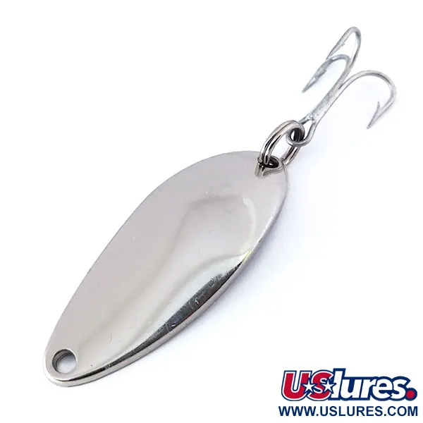 La placcatura in nichel lucidato cattura la luce lungo il profilo snello di questo ondulante da 4 cm (1 1/2"). Con un peso di 7 g (1/4 oz), l'Eppinger Dardevle Devle Dog 5200 reca il distintivo marchio "DETROIT U.S.A." sul lato concavo, collocando la sua produzione nell'era precedente al trasferimento dell'azienda a Dearborn nel 1959. Questo specifico esemplare, identificato dal codice prodotto 10446, è in condizioni 5/5, mantenendo la sua brillante finitura a specchio senza segni di usura. Le scritte impresse sono straordinariamente nitide, un dettaglio molto ricercato dai collezionisti di attrezzatura d'epoca del Michigan. È armato con un robusto anellino spaccato e un'ancora argentata affilata, progettata per lo spinning o la traina in diverse condizioni di trasparenza dell'acqua. La costruzione robusta fornisce una massa significativa per le sue dimensioni, consentendo lanci lunghi e controllati controvento. L'occhiello di fissaggio non mostra segni di utilizzo, riflettendo il suo eccellente stato di conservazione nel corso dei decenni.