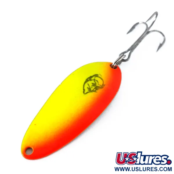 Lungo 5 cm (2"), questo esemplare presenta una vivace sfumatura fluorescente che passa da un giallo brillante a un arancione intenso. Questa specifica esca Eppinger reca il marchio "DEVLE-DOG 5300 DETROIT U.S.A." sul retro nichelato, identificativo delle sue radici di produzione prima del trasferimento dell'azienda nel 1959. Con un peso di 10 g (1/3 oz), il corpo in metallo solido è dotato di un robusto amo triplo fissato da un pesante anello spaccato. La faccia anteriore è decorata con il classico logo nero a testa di diavolo, sinonimo della lunga storia del marchio nel Michigan. Progettata con proprietà UV Glow, la finitura è pensata per offrire visibilità in condizioni di scarsa illuminazione o in colonne d'acqua più profonde durante il lancio o la traina. Questo esemplare, identificato dal codice prodotto 10361, è inutilizzato e si presenta in condizioni eccezionali. La nichelatura sul lato opposto è lucida, in contrasto con la vernice fluorescente ad alta visibilità sul lato convesso.