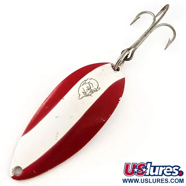 Lungo 5,5 cm (2 1/4 pollici), questo classico cucchiaino ondulante Eppinger rappresenta un pilastro nella storia delle attrezzature americane. Il motivo a strisce rosse e bianche è completato dall'iconico logo con la testa di diavolo stampato sulla superficie anteriore. Questo modello specifico, il Devle Dog 5400 (Codice Prodotto 11797), presenta un peso di 14 g (1/2 oz), adatto a raggiungere zone più profonde durante il lancio. Girando l'esca si nota il marchio „DEVLE-DOG 5400 DETROIT U.S.A.“ impresso chiaramente sul retro rifinito in nichel. L'attrezzatura consiste in un robusto amo triplo fissato tramite un anellino spaccato in coda. Valutato 5/5, la finitura mostra minimi segni di utilizzo, inclusi piccoli distacchi di vernice vicino ai bordi, comuni per un'esca di questa età. L'eredità di qualità di Lou Eppinger è evidente nel metallo pesante e nella geometria semplice e funzionale della paletta.