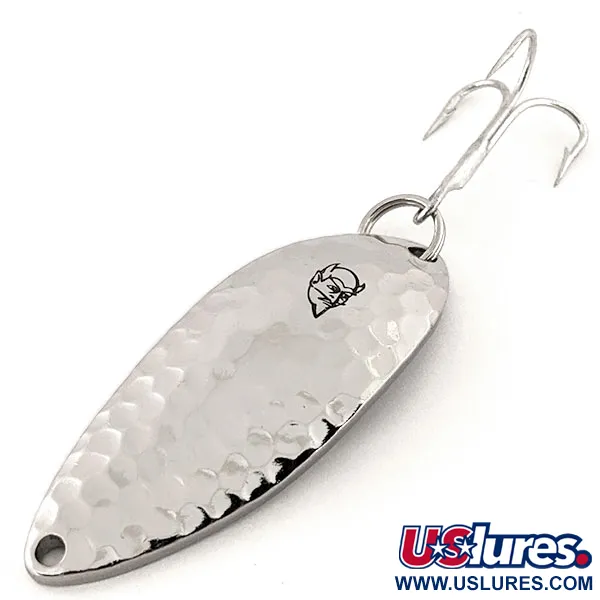 Il nichel martellato offre una texture brillante che cattura la luce sulla parte anteriore di questo ondulante, una finitura progettata per un'alta visibilità. Con un peso di 3/5oz (16g), questo Eppinger Dardevle Devle Dog 5400 è identificato dal codice prodotto 13067. L'iconico logo con la testa di diavolo è nitidamente stampato al centro del lato strutturato, mentre il lato posteriore liscio presenta incisioni profonde per il nome del modello e il luogo di produzione a Dearborn, Michigan. Questo esemplare è in condizioni 5/5, con una superficie lucida e pulita e componenti originali, tra cui un robusto amo triplo fissato tramite un anello spaccato. Eppinger utilizza questi stampi proprietari nel suo stabilimento del Michigan dal trasferimento da Detroit nel 1959, mantenendo la struttura resistente su cui collezionisti e pescatori contano da oltre un secolo. L'occhiello di testa rimane libero e ben formato per il lancio o la traina.