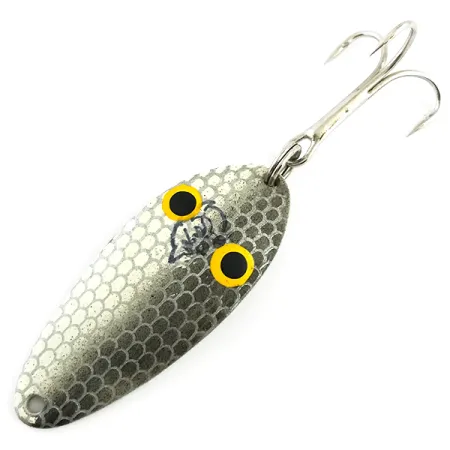 Scaglie argentee e grigie definiscono il lato anteriore di questo ondulante lungo 5 cm (2 pollici). Questo Dardevle Devle Dog pesa 10 g (1/3 oz) e presenta due grandi occhi gialli con centri neri ai lati di una piccola icona a forma di bulldog. Il retro del corpo in metallo rivela una finitura in nichel lucidato con la dicitura «DEVLE-DOG 7600 DETROIT U.S.A.» stampata in nitidi caratteri maiuscoli. Questa punzonatura richiama la storia del marchio a Detroit, dove Lou Eppinger iniziò a produrre esche a mano nel 1906, prima del trasferimento dell'azienda a Dearborn nel 1959. L'esca è in condizioni 5/5, conserva la sua ancoretta originale e mostra la fattura di alta qualità derivante da stampi proprietari. A fini di inventario, questo esemplare è identificato dal codice 5782. Il peso e la forma specifici sono calibrati per il lancio in diversi ambienti d'acqua dolce.