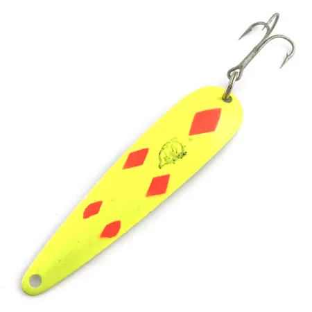Lungo esattamente 8,5 cm (3 1/4"), il Dardevle Flutter Chuck #3100 dimostra perché la livrea Five of Diamonds rimanga una delle preferite dai pescatori di lucci e trote. Un peso di 9,5 g (1/3 oz) rende questo ondulante Eppinger, catalogato con il codice prodotto 23470, ideale per il lancio verso strutture profonde. Cinque distinti rombi rossi sono posizionati su una finitura gialla accesa, con l'iconico logo del diavolo del produttore centrato sulla parte frontale. L'armatura include un'ancoretta fissata tramite uno split ring alla base del corpo affusolato dell'ondulante. Prodotto negli USA, la struttura metallica è valutata in condizioni 5/5, a testimonianza dell'alta qualità della verniciatura e delle stampigliature originali. L'artificiale è indicato per tecniche standard di casting o traina in acque interne.